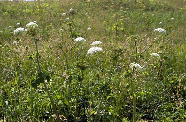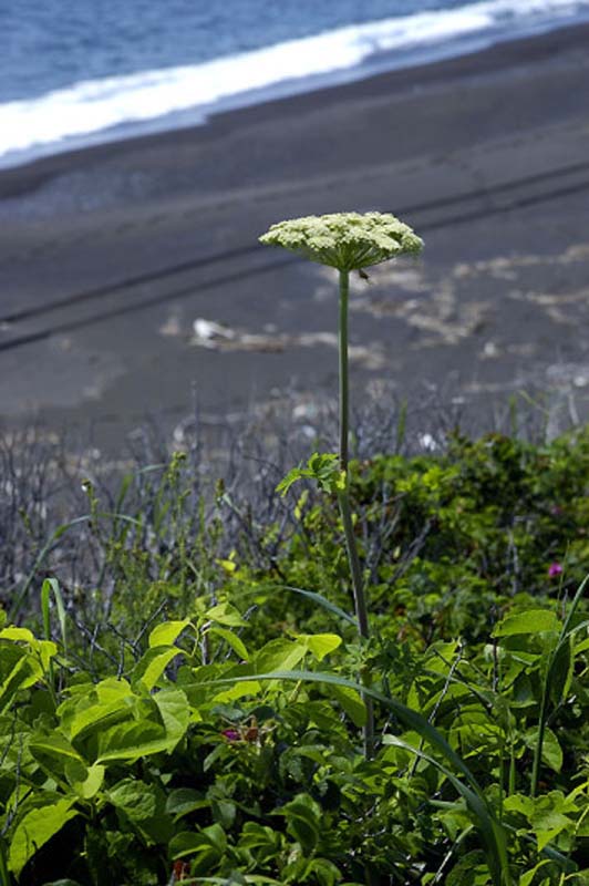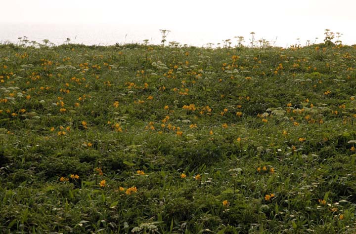 | コメント:海岸線では、既にエゾカンゾウは終っています。早いものです。今は、左の写真のエゾノシシウドやエゾニュウ、エゾノヨロイグサなどの白い花が咲いています。 |