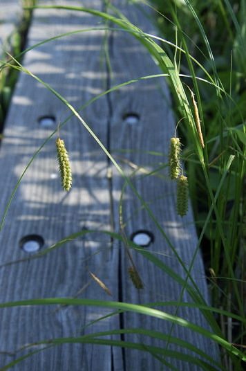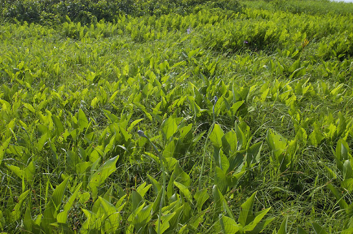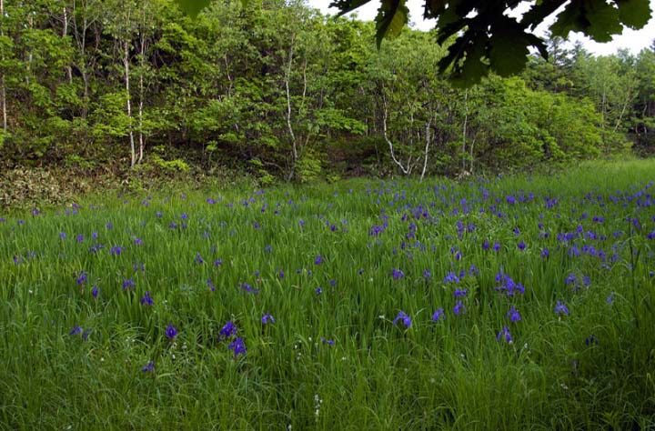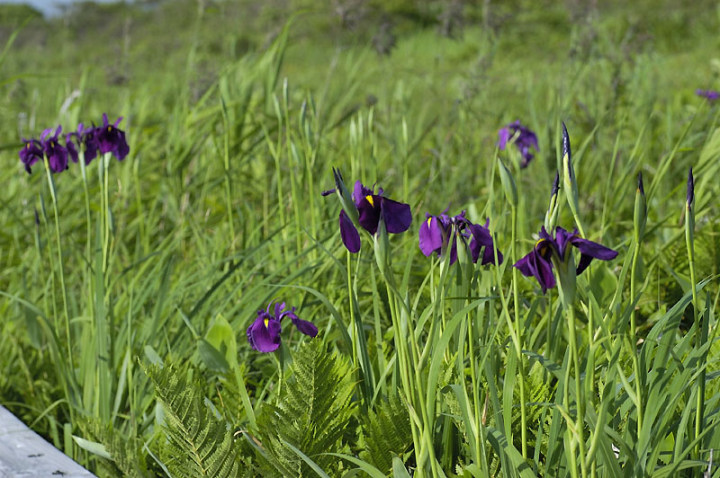 | コメント:ノハナショウブが咲いています。やはり、ビジターセンターより早く咲きますね。チシマアザミも咲いていました。オオヤマフスマという花も咲いていました。また、スズメノヤリ、ゴウソ、イグサなどの植物も見られました。 |