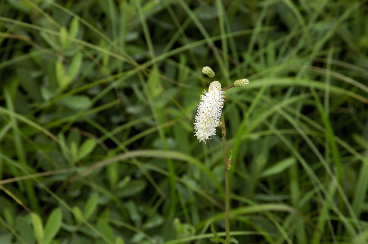 | コメント:ナガバノシロワレモコウが咲き出しました!きれいな白い花ですね。茎先で分枝し、枝先に円筒状穂状花序となります。(photo by M) |