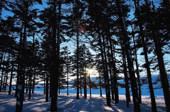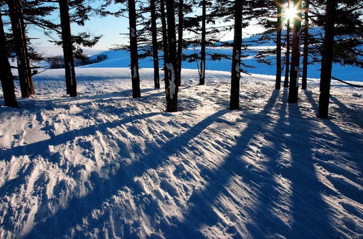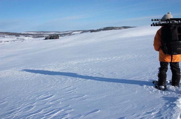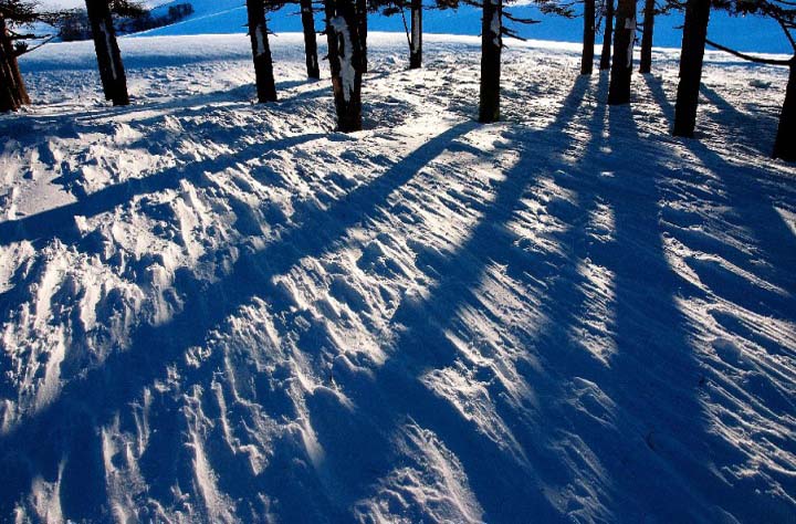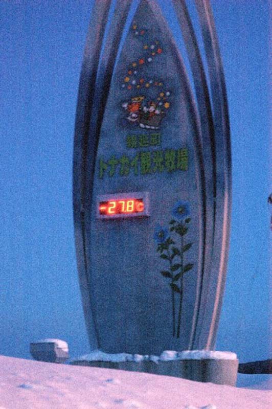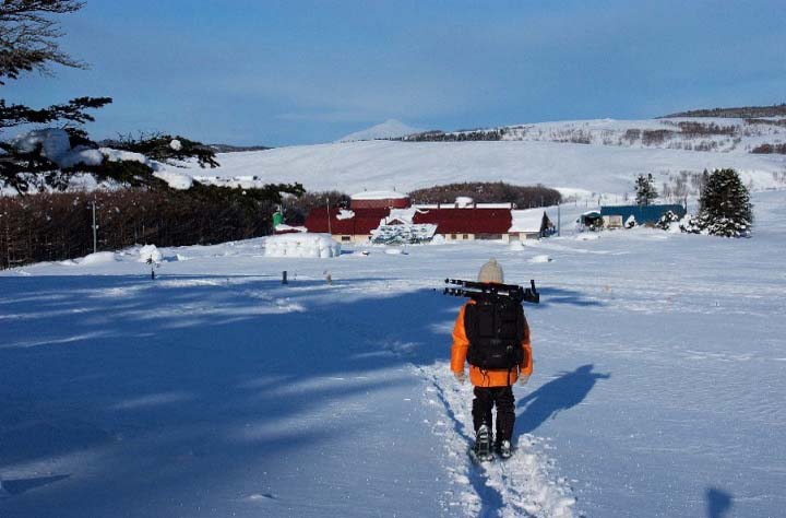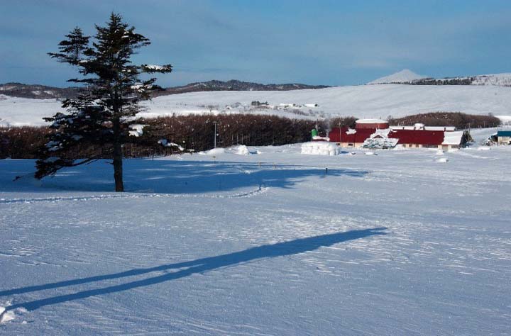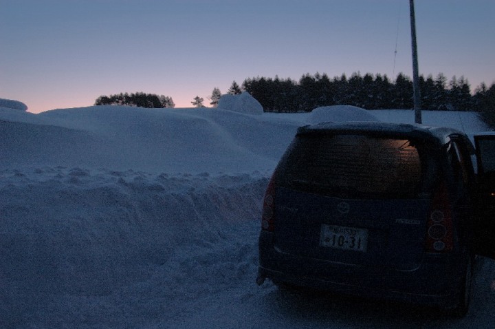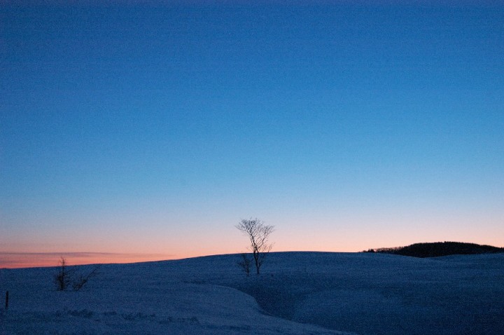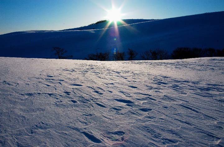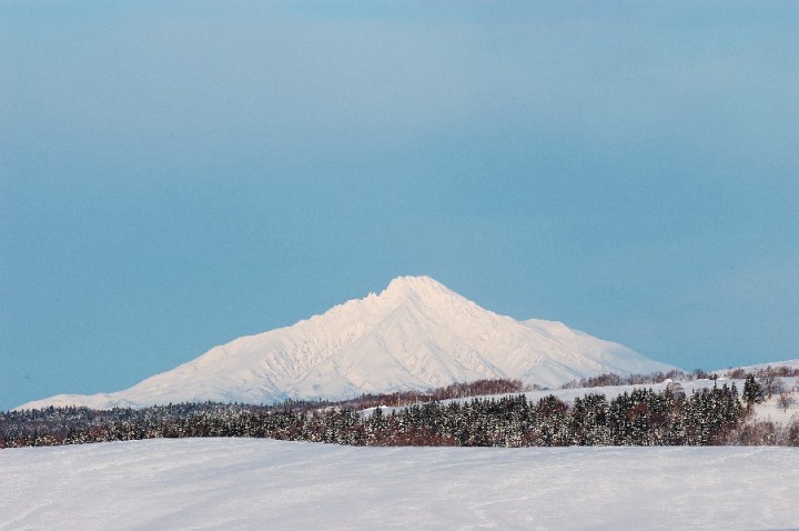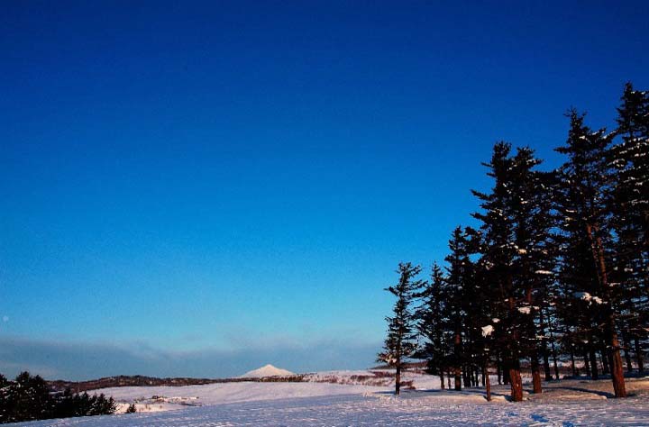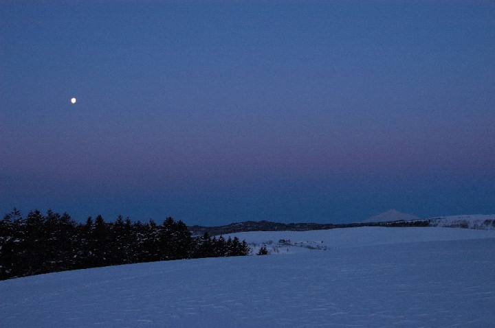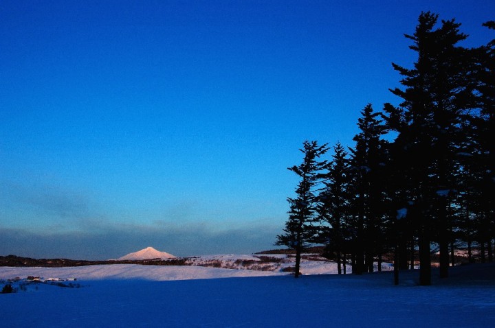 前日に夜間撮影をした折、あまりにも利尻山がきれいに浮かび上がっていたため、早朝もきっと…との願いを抱き、早起きして出かけました。 最近、おきまりのトナカイ観光牧場の温度計は−27.8℃でした!今朝も冷え込んでいます! 2005/02/18の撮れたて画日記で紹介しました、気になるスポットを通り抜け、目的地を目指します! そして、いつもの場所に車を止め、丘を目指します!だいぶん、東の空が白やんできましたが、まだまだ大丈夫!!今日はいつもの場所よりちょっと奥にカメラをセットし撮影開始!!いつもの松林が右手に見える位置です。 久々にこの北進から見た利尻山に感動し、何枚も撮影します。朝陽を受けた利尻山はピンク色に染まります。とてもきれいでしばし時の流れを忘れるかのようです。アップでも…。 どんどん陽が昇り、青空が見えるようになりました。通称「北進の丘」をいろいろな角度から迫ってみました!利尻山と一緒に…、青空を背景に…、さらに内部に進入…、松林の影を主役に…、さらに眩しい太陽を入れて…。 と、どんどん撮影が進みます。いつも、この「北進の丘」は西方から東方にカメラを向けて撮影します。こんな感じに…。その林の向こう側はこのようになっています。 林の中から出ますと、利尻山はこのように純白の姿を見せてくれました。もう一枚! そろそろ、帰路に着く時間になりました…。早朝は天候が良かったのですが、ちょっとずつ雲が出てきまして、9時くらいには利尻山が見えなくなりました。 そして、最近お決まりの自写像を…。影だけですね…。では、もう少し…。丘を降る姿も…。 今日は、自写像も満載でした! それにしましても、前夜&早朝と北進を堪能できまして、良い週末でした! |