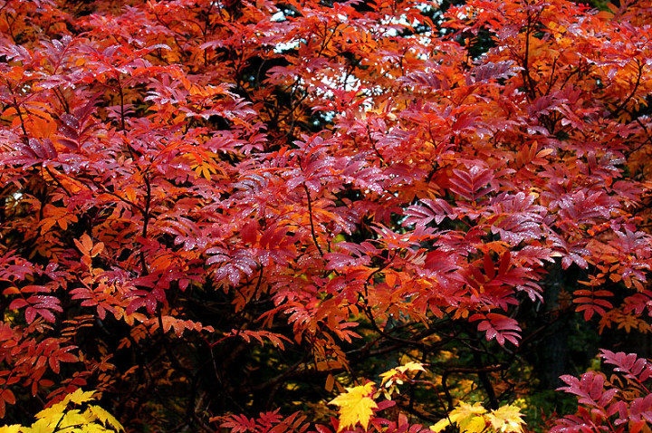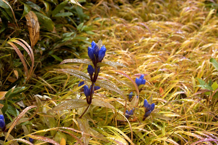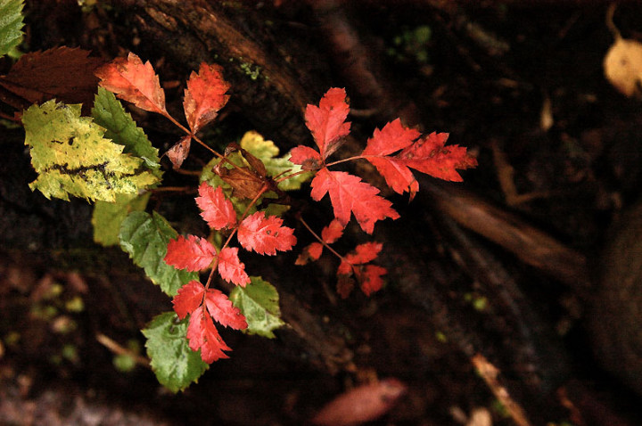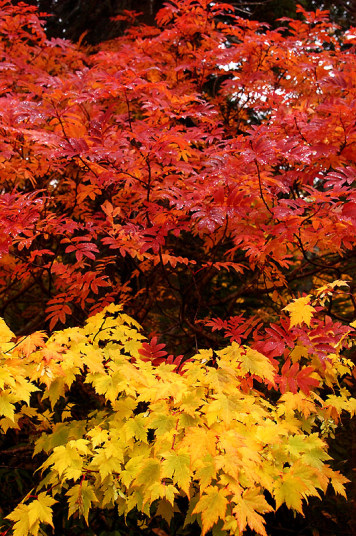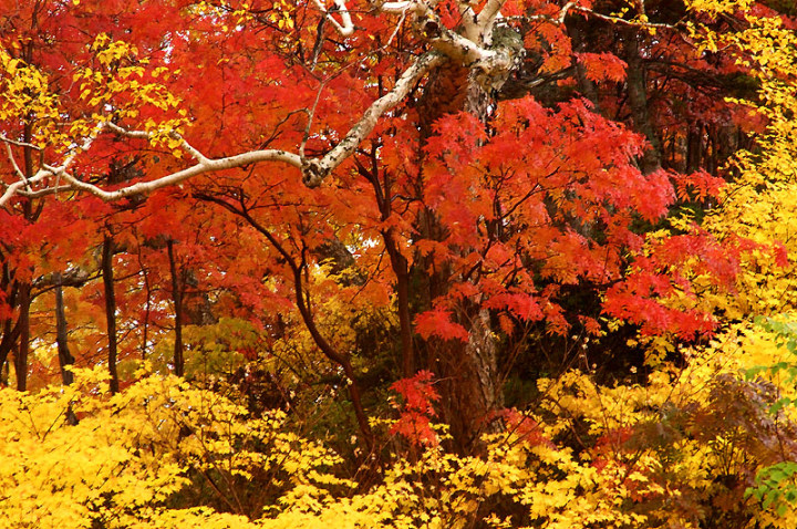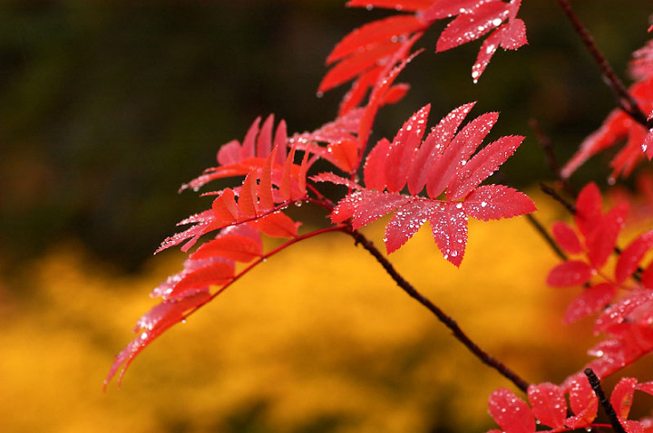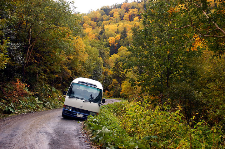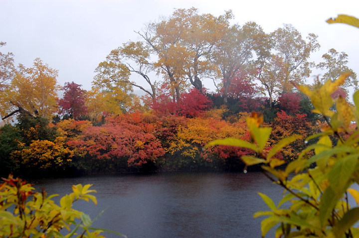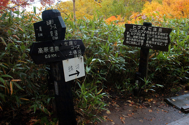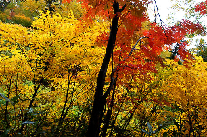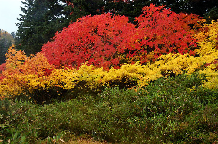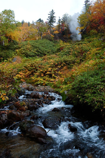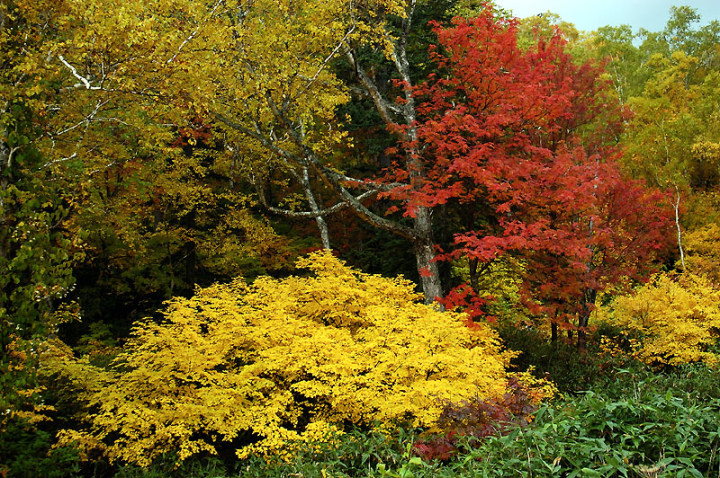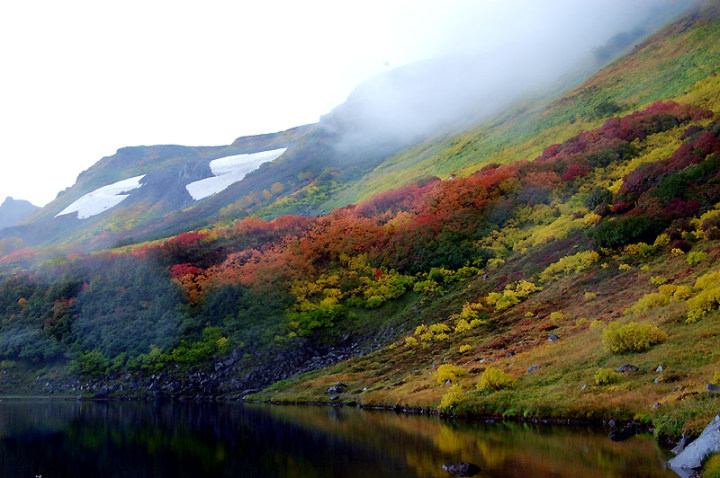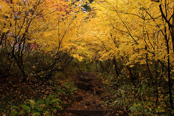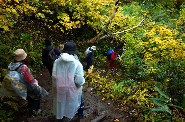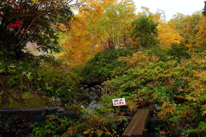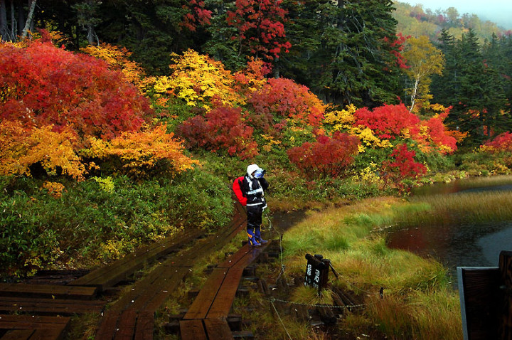 今日の「撮れたて画日記」は、「登山画日記」に掲載される種類のものなのかもしれませんが、この「登山画日記」となりますと、作業が遅々延々として進まず、未だに時間を見つけては、8月前半に上ったトムラウシ山の1日目などを手掛けておりまして、いつになるのか分かりませんので、こちらに掲載致します。 さて、北海道の山々では9月ともなりますと徐々に秋の気配を帯びてきまして、大雪山は北海道の紅葉の始まりと言われております。北海道ではなく、日本の紅葉の始まりなのでしょうか…。 9月には3連休なるものがありますので、この連休で紅葉登山にでも行こうか…、と計画していたのですが、ちょうど良い時期に風邪にかかってしまい、計画は頓挫してしまいました…。 とても悔しいので、10月最初の土曜日、午前2時起きしまして、行ってきました!! 今回、3箇所ほど山歩きを選定しましたが、2箇所はまずまずの登山になり、後の1箇所は山歩き、という感じになります。同行する山歩き2回目のshoちゃんの体力を考慮しまして、あまり辛くない高原沼と決めました。 実は、ここ、例年ですと9月20日過ぎが見頃でして、10月に入ると、店仕舞ならぬ、紅葉仕舞となるのですが、今年は不思議な気候で、未だ暖かい。よって、紅葉も遅めに進んでおりまして、ちょうど見頃なところもあるのかと思い、選定しました。大雪山の情報は上川町のホームページや上川町層雲峡ビジターセンター便りなどで最新情報を入手することができます。 この週は、かなり好天に恵まれておりまして、紅葉散策も好天が期待されたのですが、どういうことでしょうか…、その日だけ、雨…。もう最悪…。かなり降雨により足場の悪くなるところでして、ブルーになりつつ車を走らせます。 案の定、幌延を出発する時には、豪雨でして、天候の回復を期待しつつ、車を進めて行きました。願いが通じたのか、目的地に到着する頃には、曇天ではありますが雨は上がり、少し気合も入ってきました。 この大雪高原沼はヒグマの生息域で、日によっては危険なため一部通行止めになります。このため、入山受付時間は午前7時から午後1時までとされており、午後3時までに下山する必要があります。そうした情報を入手し、注意を喚起するために、このヒグマ情報センターから入山することになります。 一周しますと、約6kmの行程ですが、この日は、高原沼までのピストンに制限されておりました。 そして、午前7時半頃いざ出発です!! 雨は雨なりの撮り方がありまして、逆に紅葉などは、雨にあたった方が、その輝きや美しさを増すものです。そういう感じの写真が撮れれば…、と願いつつの山行となります。 まず、センターの裏の木々に見とれて、前へ進まず…。結構、色付いておりまして、楽しみ〜。雨も落ちていません!! と思ったら、だんだんと雨が降り出しまして、強くなっていきます…。最初は紅葉トンネルのような木々に覆われた道を歩くため、さほど気になりません。背景に青空がありますと、見上げる紅葉写真が美しいのですが、今日の天候では難しいので、下に目を向けます…。 800m程進みますと、ヤンベタップ川が現れます。この川、すぐ上流に温泉が湧き出ていまして、湯気が立ち込めておりますが、上流方面へは「危険に付立入禁止」の看板が立てられております。 この川に架けられている板橋を渡りまして、少し上りますと、ヤンベ温泉分岐があり、周回コースとなりますが、右コースには侵入できません。 少し進みますと、徐々に紅葉が深まっていきます。きれいな枝葉が近くに見られるようになりました。黄色は良い感じなのですが、赤がいまいち…、に感じられます。 そして、いよいよ頭を覆う木々地帯から抜け出しますので、全身が雨にさらされることになります…。しっかり、雨具で体を覆いまして、カメラもカメラ用の雨具で防水対策です。 最初の沼、土俵沼に到着です。が…、ひどい雨…。水面のはじけ具合が分かりますでしょうか!?土俵の形をしているそうです。 続きまして、芭蕉沼。ここは、春先に水芭蕉が咲き誇るようで、この名前のようです。 この雨ですと、水面に写り込む紅葉などは期待できませんので、紅葉している葉に注目!!雨がいい具合に付着しております。 次は、滝見沼です。ここが一番きれいな紅葉だったような気がします。手前の水面を入れて写真を撮りたかったのですが、雨ザーザーでしたので、遠くの紅葉だけを切り取ってみました。少し粘って見たのですが、止むどころか、だんだんと雨が強くなってきまして、立ち去ることにしました。帰りも通りますので、その時に雨が止んでいてくれれば…、との願いを込めて、歩みを進めます。 次も、とても有名な沼で、緑沼です。滝見沼との距離は0.1kmと表示されていますが、それ以下の距離表示ができないためでしょうか、100mも歩かず到着します。これは、土俵沼から緑沼まで、すべてに言えることです。この緑沼もなかなか