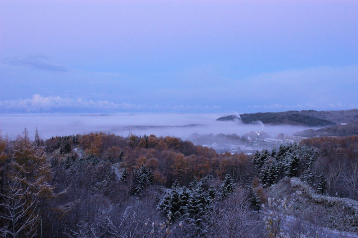 久々の早朝撮影です。 冬の初めにぜひ行っておきたい場所って結構あるんですよね。 雪が積もると車で行けなくなりますので、その前に…行っておきたいのです。 今朝は、幌延の街を一望できる林道(?)に行ってみました。 お気に入りスポットより少し奥まで行ってみました。幌延の街が見えます。 なんだか、水墨画のような中国っぽい景色も見えました。 初冬の木々は、少し雪をかぶって、そして融けて、そして夜の低温で枝葉が凍ります。そして夜明けの朝陽を浴びてキラキラと輝きます。これは、雪がしっかり積もると見られない光景です。今しか見ることができない貴重な木々です。 特に落葉松(カラマツ)は、この時期黄葉しますので、氷と相まってすばらしい景色を見せてくれます。 タイトルの写真は、この時期のお気に入りのスポットです。落葉松が斜めに並んでいて、しかも、奥には黄葉しない松林が並んでいて、その交差する感じがとても好きです。 朝陽を浴びて本当にきれいな朝でした〜。 こんな景色を見ると、仕事も気持ちよくこなせ(?)ます。 |