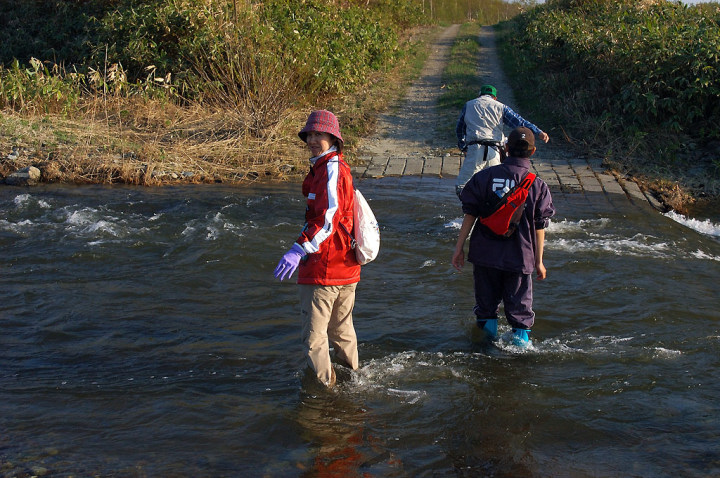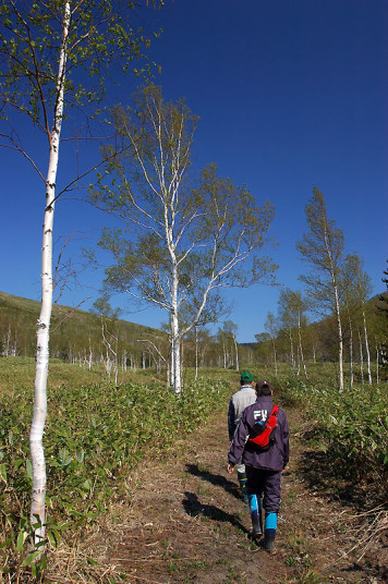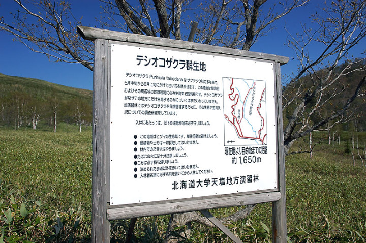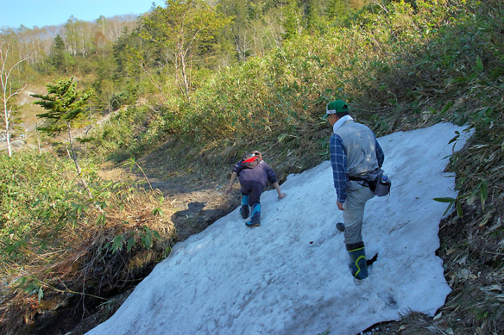幌延町の町花となっている「テシオコザクラ」。 幌延町の問寒別という地区から隣町の中川町歌内にかけての蛇紋岩地帯にだけ生育している固有種と言われております。まだ、その理由は分からないようです。 今日はその町の花の探索会です! 職場に、ぜひ私にその花を見せたい!という方がいらっしゃいまして、私もぜひ見たい!ということで行ってきました。 この町に住んでいるからには、一度は見ておかねば…。 車を止めて、片道3`の道のり。 途中、3度の渡渉を経て辿り着きます。雪解け水で増水中の川ですから、長靴を履いたところで、ビチョビチョです。 水流の強さに流されるのではないか!?と不安に思いながら。テクテク目的地を目指します。 半分くらい着たところで、標識発見!! 平坦な道のりではありますが、清々しい春の空のもと、山歩きをするのは気持ちのよいものです。 残雪などもある道を歩き続きまして、小1時間。ようやく群生地に辿り着きましたが…。今年は春が遅く、未だ咲いていないようです…。このような、蛇紋岩地質の崩壊した崖に咲くそうです。 しかし、丹念に探すと、何株か咲いておりました〜。葉と花目はこんな感じです。 いや〜、かわいらしい!!素晴らしい!!大感激!! 斜面一帯に咲き乱れるらしく、そんな景色を見てみたいものです。来週末が見頃かも…。また、行きたいです!! 帰りも、水量のある川を越えます。流されないように、皆で手をつないで渡ります。 一番水流の激しかった川です。もう、ズボンもビチャビチャ。 でも、楽しかったです!! |