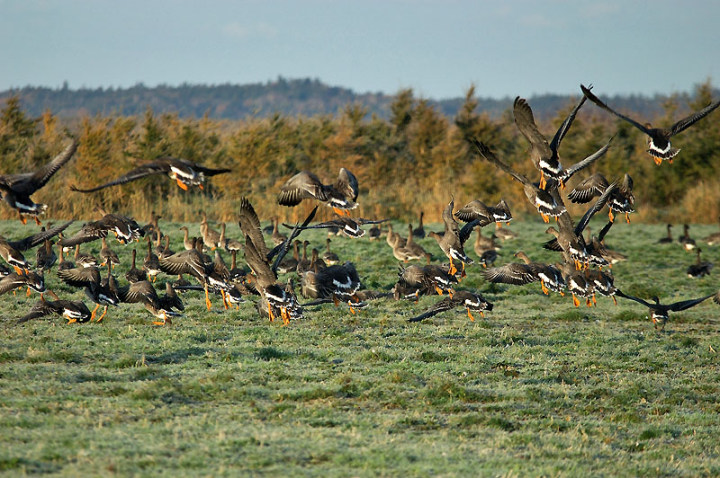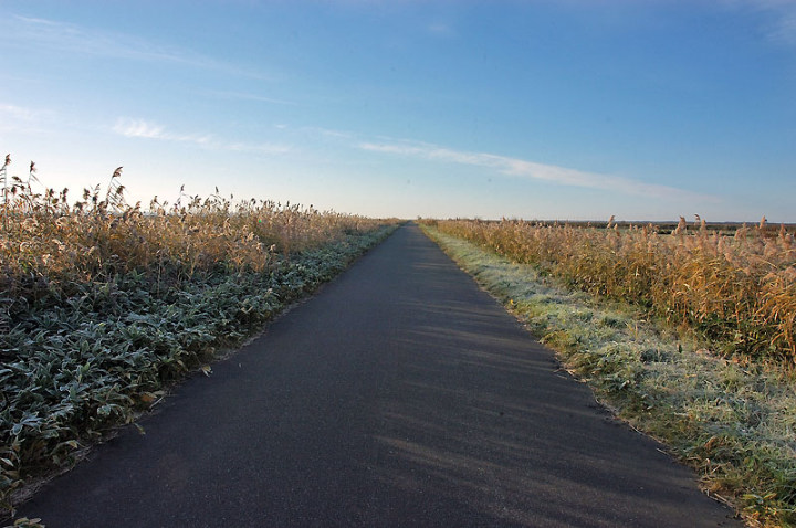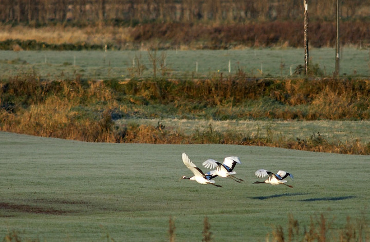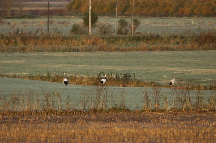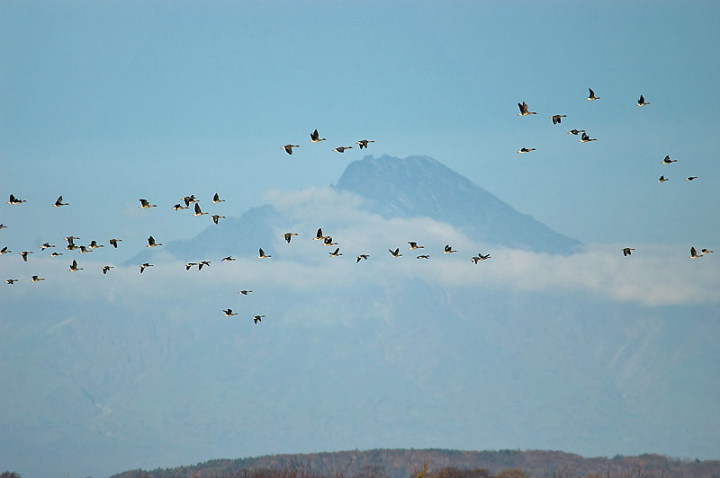 今日は、2枚メイン写真にしました。写真としては、2枚目なんですが、丹頂鶴も捨て難く…。 本日は、久々に早朝撮影です!。 職場にマチの議会議員さんがやってきて、"鶴撮ってるか?"とのこと。たまに、探しに行くのですが、なかなか巡り合えないのです。ということで、利尻山もきれいに見えそうな天候が予想されますので、早朝撮影してきました。ガソリンの残量が心配でしたが…。 本当はもう少し早起きする予定だったのですが、お寝坊しまして、午前6時の出発。 しかし、サロベツ原野へ向かうと、残念ながら利尻山はうっすらとしか見えず、利尻山中心の撮影は断念。なので、鶴探しに専念です。 何度かエリアをくるくる周回しまして、何やら白い物体を発見!!(写真右下に3つの白いものが見えますか?)目を凝らして見ると、丹頂鶴でした〜。撮影場所から振り返るとこんな場所です。 嬉しい!!優雅に歩いております。 デントコーン畑の残骸から餌を見つけ、水を飲んだりしているようです。 サロベツ原野で丹頂鶴が営巣!と聞いてから早3年ほど経過するでしょうか…。ようやくこの目で見ることができました。それにしても、優雅な姿です。 昔(100年くらい前)は北海道全土で丹頂鶴を見ることができたようですが、乱獲で絶滅の危機に瀕したようです。その後、道東で餌付けが行われ、個体数が増加していったそうです。 そして、数年前からサロベツ原野に丹頂鶴の夫婦が夏場飛来するようになりました。 どうやら、道東では個体数が増えてきて住みづらくなったのではないか、というようなことを聞いたことがあります。 昨年、二羽の幼鳥が無事成長し、冬に四羽で道東へ飛び立って行きました。今年は一羽の幼鳥が成長しており、三羽で行動しているようです。 と、そのうちに飛び立って行きました。 その後、丹頂鶴を追いかけるように北に進んだのですが、丹頂鶴はどこへ行ったのやら…。 代わりではないですが、たくさんのヒシクイと思われる渡り鳥が畑に密集していました。私が車から降りると、警戒して皆で一気に飛び去ります。利尻山をバックに飛翔する鳥たちは、どんな光景を目にしているのでしょうか…。 その後、私が野鳥ロードと勝手に名付ける農道がありまして、ゆっくりと車を進めます。ここの真っ直ぐに続く道と広い空が大好きです。 その後、仕事の時間もありますので、マチへ戻りました。 そして、マチの中で、いつも自転車に乗りながら気にかかる風景があったので、ちょっと撮影。公園なのですが、落ち葉がいっぱいで惹かれるものがあります。 だいぶん陽が昇って気温も上がってきましたが、それでも落ち葉には霜が付着していました。もう、冬なんだな〜と思わされる光景でした。 |