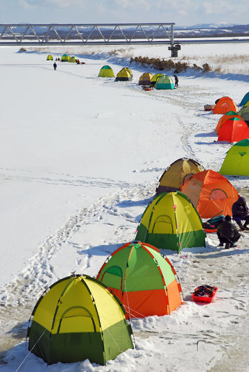 2月7日から東京へ行って来ましたが、稚内空港へ向かう途中、声問川でチカ釣りなのでしょうか…。無数のテントが設営されておりました。