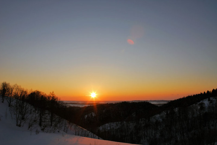 今日は狙い通りの夕陽を見ることができました。 あまりに快晴だと、太陽がまぶしすぎて写真に撮れないのですが、今日は日中から利尻山もボーっと薄曇りがかっておりまして、こういう時は夕陽が真っ赤に染まるんです。しかも、光が少し弱くなるので太陽の輪郭がくっきり写りまして、夕陽撮影にはもってこい!というわけです。 日没が午後5時15分頃であることをチェックして、自宅の裏山に出発です。以前から直線距離にして10kmはあるであろう風車群と夕陽が重なると思われるスポットを発見しておりまして…。いろいろイメージを膨らませつつ…。 夏は車で行けるのですが、冬はスノーシューです。片道2.5kmを1時間弱かからずに頑張って歩きました。荷物が20kgくらいあったので、途中具合悪くなりましたが…。 今回は太陽撮影なので、一番大きなレンズを背負って行きました。それだけで、6kgくらいあるので、かなりしんどいです。 東京で購入したレンズの焦点距離を2倍にしてくれるテレコンバーターも一緒に持って行きました。まぁ、試写というところでしょうか〜。 汗だくになりながら、なんとか日没前にたどり着きました…。 三脚を立て、レンズとテレコンバーターをセットしカメラを取り付けます!! すると、まさに思い描いたような光景が…。 日本海に落ちてくる夕陽と一直線に並ぶ風車群、絵になります。 そして、早いスピードでどんどん夕陽は沈んでゆきます。海面が太陽の台座のようでした。 夕陽が海面に吸い込まれてゆきました。 陽が沈んでからも、ややしばらく残照が空をきれいに染めており、うっとり眺めながら帰ってきました。どんどん暗くなりましたか、頭上の月が山道を照らしてくれ、なんだかほんわかと暖かい気持ちになりました。嬉しい日曜日の午後でした…。 |
