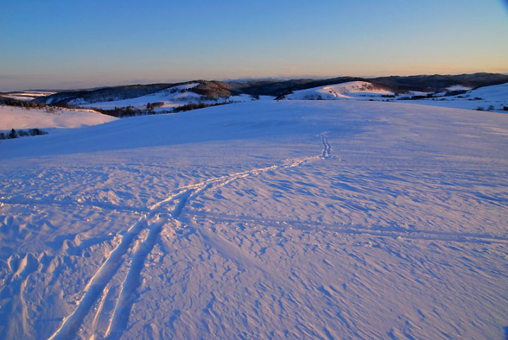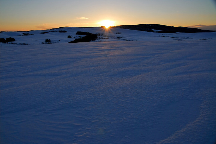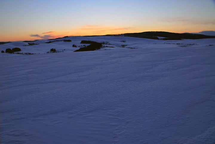 いつの間にか2008年になっておりました。 皆さんご無沙汰しております。 今年も、マイペースで更新する予定ですので、いつの間にか更新されていた…、ということがありませんよう、欠かさずチェックしてください。 よろしくお願いします。 さて、2008年に入って、私のライフワークである利尻山は元旦に姿を現して以来、全く雲隠れしております。 ようやく、青空が見えてきたな〜、と思っても、相変わらず雲隠れ…。 ということで、利尻山はあきらめまして、北進地区へ出向きました。 本日の気温は、トナカイ観光牧場で−17℃であります。寒い寒い…。 昨年の暮れに、撮影道具としてスキーを購入しました。これで、少し移動範囲が広がりそうです。 ちなみに、スキーの板の裏にはモヘアと呼ばれるアンゴラ羊の皮が付いてまして、上りは滑らず、下りも滑らず漕ぎ漕ぎ下りるというシールが大活躍。あちこち散策できます。 道路から、2`ほど上った丘からきれいな朝焼けを見に行きました。寒い中ですが、相変わらず素晴らしい表情を見せてくれます。 朝陽が昇ってきました。なかなかいい感じ。 そして、陽の出。凍て付く大地を照らしてくれます。 そうすると、今まで見えなかった、雪紋がはっきりくっきりと見えてきました。 誰が手を加えたものでもありませんが、どうしてこのような紋様が出来上がるのか、不思議ですよね…。 |