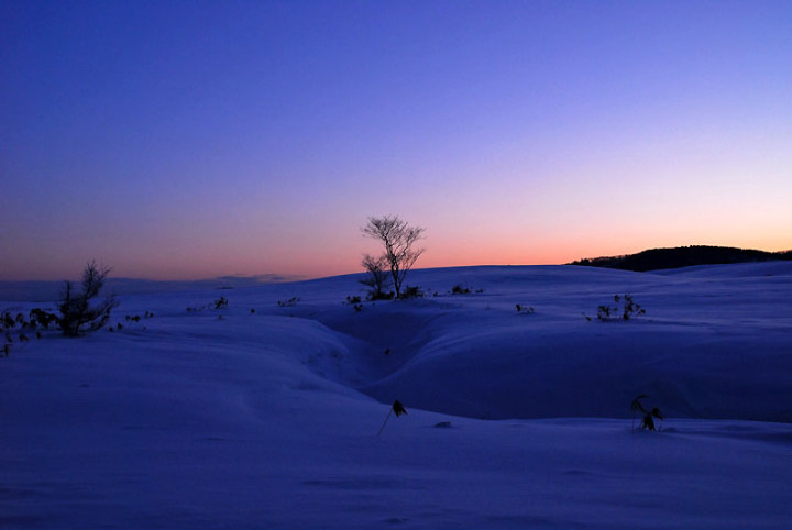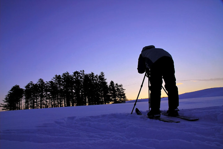 北進大好きで、またまた北進地区へ…。 今日の温度は、−22.5℃です。寒いです…。寒さできれいな朝焼けです。 今日は、勝手に命名している北進の丘へ…。 車を置いて、写真スポットまでは、スキーをはいて10分足らず。スノーシューでも15分もかかりません…。 日の出前からカメラをセットしまして、しばし待ちます。 西の空が輝いてきました。 しばらく待つと、ようやく丘の向こうから日が昇ってきました。きれいです!! 久々に北進の丘を堪能しまして、自分までポーズを決めて写してみたり…。 そろそろ仕事に遅れそうな時間ですので、スキーですーっと下り、車を運転していると…。 道沿いの木々が朝陽を浴びてきれいに輝いているではないですか!!これは撮らねば…。ということで、車を降りてしばし、撮影…。樹氷が朝陽で輝いておりました。美しい…。 |