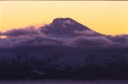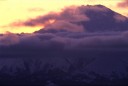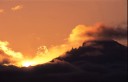 | 太陽が利尻山に沈んでゆきます。 頂上に至る切り立った稜線がぼやけて見えます。別の写真ですとはっきり分かりますが、他の部分ははっきり見えますので、これは、流れ行く雲が発生しているのか、ボヤボヤと見えるのでは…と勝手に思っております。 |