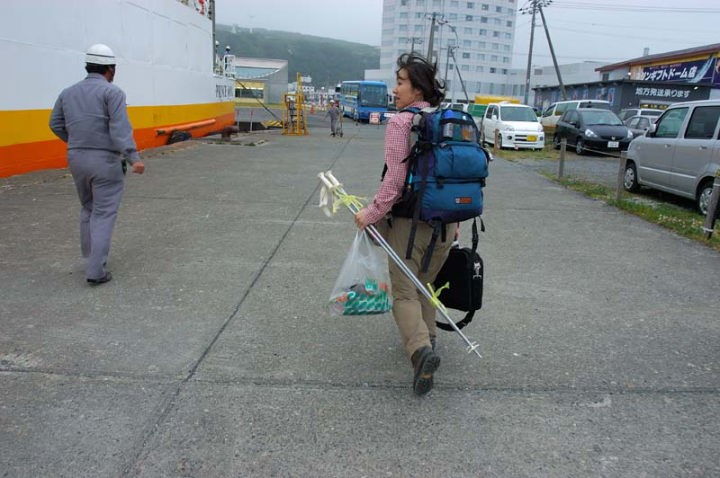 | 今回の登山を象徴するかのようなハプニングが最初に起こりました!11時10分稚内発のフェリーで利尻島鴛泊へ渡る予定だったのですが、何を勘違いしたのか、11時20分発と思い込んでいまして、妻をフェリー乗り場に残し、車を少し離れた無料駐車に持って行って、と言いますか、まだまだ余裕と勘違いし、電器屋さんなんかへ行っていたのが間違い…。 まだまだ大丈夫と思いつつも、万が一と思い、少し小走りにフェリー乗り場へ到着すると、人もまばらで…、あれ!?おかしいな〜。 一人、妻が泣きそうな顔で立っているではありませんか!? なんと、もう、船は出航しそうな状態でした…。 慌てて、荷物を持ち、フェリーに駆け寄ると、既に、一般乗船用の架け橋は取り外されており、出港準備完了!という体勢にありました…。 係員「あんたたち、乗るの??」 「乗りま〜す!!」 係員「乗船券持ってる?」 「持ってま〜す!!」 係員「じゃ、こっち来て、早く!!」 と、問答の末、車用の乗船口から乗ることになりました…。いや〜、ビックリ!!危なかった〜。 |