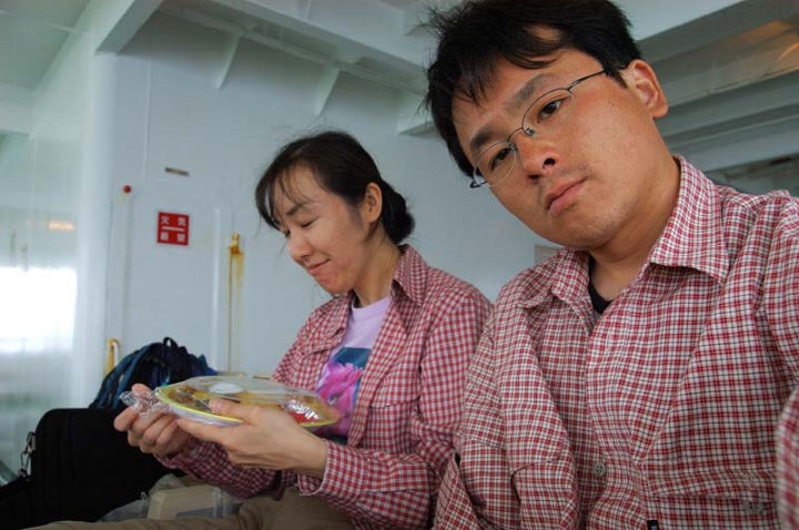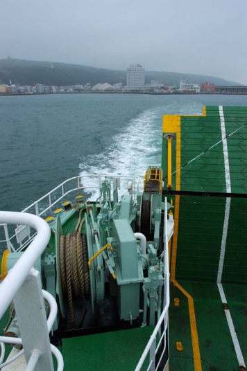 | なんとか無事、出航できました…。なんだか、わたしたちのために、数分出航が遅れたような気がします…。 申し訳ありませんでした…。 緊張がほぐれ、お腹も空いたので、お昼ご飯にしました。稚内の西條百貨店で購入したお弁当を食べながら、二人の会話は、「いや〜、危なかった…」というものばかり…。 ずいぶん混んでおり、中に座ることができませんでしたので、外の椅子に座っておりました。 すると、後ろの座席から親しげに声を掛けてくる、ちょっと赤ら顔のおじさんが…。どうやら、山梨県から一人旅しているようなんですが、利尻山に関する情報を求めてきましたので、知っている範囲でお答えしておりましたら、ものすごく感激されちゃって、車で来ているので、キャンプ場まで乗せてあげると…。 お言葉に甘えて、キャンプ場までお願いすることにしました…。 |