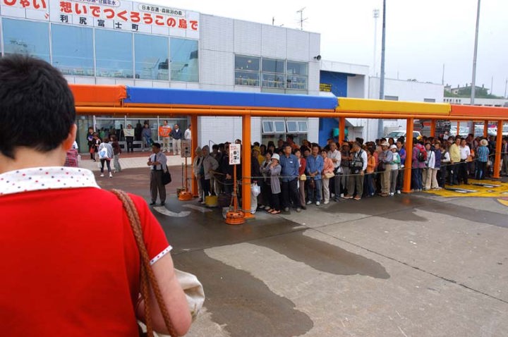 | 船は全く揺れることなく、利尻富士町鴛泊へ。観光客がたくさんでした…。 利尻島には、日本百名水という美味しい水があります。今、廃校を利用して、この水の販売を行う会社もできたようです。本当に湧き出ているところは、3合目から少し歩いたところなのですが、島のあちこちに百名水と称した水が飲めるようになっています。汲んできているのでしょうか?引いてきているのでしょうか?フェリーターミナルにもありました! |
