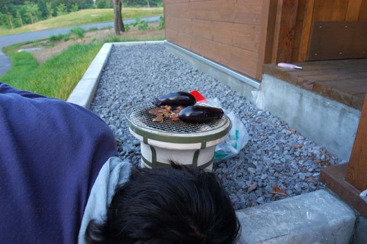 | 火を熾していると、例のおじさんが盛んにやって来ては、いろいろご指導くださいます。まき風呂をよく焚くとかで、火熾しは任せてくれ〜!という感じでした。 しちりんの下から、ふ〜ふ〜、息を吹きいれ、火を熾してくれています。 結局、この写真だけが、おじさんの姿を写した写真でした。 そして、肉を焼いて、おにぎりを食べ、少々ビールを飲み、夕食終了!! |