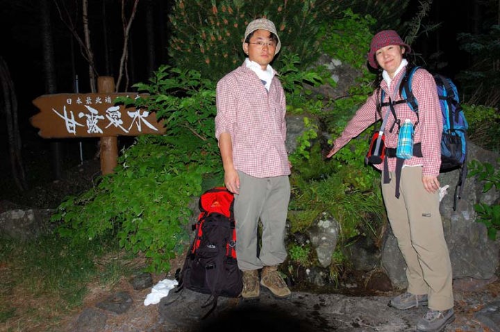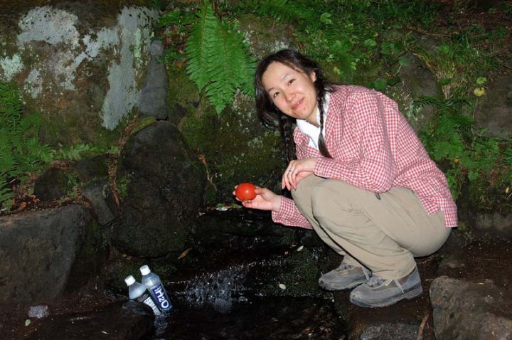 | 登山道入り口から、勾配の緩い道を500メートルほど進みますと、有名な甘露泉水に到着です。日本百名水の一つです。本当に美味しい、甘い水です。ここで、持参したトマトを冷やし、前日購入した餅と一緒に食べました。 これ以降は水がありませんので、十分の取水が必要です。 |
