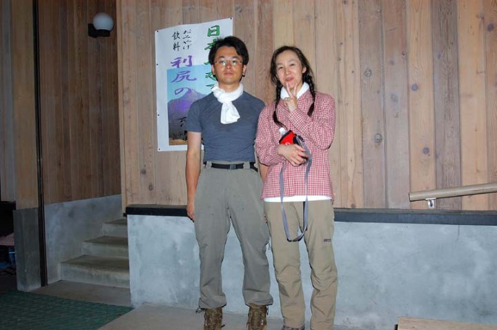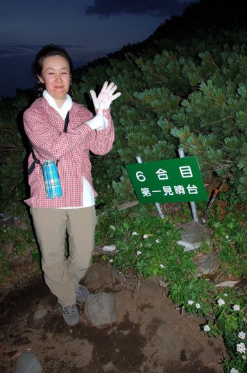 | ここを出発したのが、午前1時40分頃ですので、まだまだ外は暗い真夜中です。ヘッドライトを装着し、慎重に歩みを進めます。 周囲の様子など分からない中の登りですので、いまいち距離感、時間共に分からず、いったい今どの辺なのだろう!?どれくらいの時間が経ったのだろう!?などと考えながら、あれ!?と思ったら、4合目の看板があり、あれ!?っと思ったら5合目に着いていました。5合目くらいまでは、背丈の高い針葉樹に覆われていますので、時々、木々の切れ目から星空が見える、という感じでした。晴れていて嬉しい〜!この調子だと、朝陽も見えるかな!? 暗闇の中での山行は、神経を通常以上に使うためか、知らないうちにかなりの疲れが溜まるようですので、5合目では、少し休憩し、軽く食事をしました。と言っても、先ほどの餅ですが…。 また、ひたすら登り、午前3時40分頃、6合目に到着!!この少し前くらいから、東の空が白やみはじめ、ヘッドライトを消して登れるようになりました。 この辺りから、かなり風が強くなってきました。そして、何時しか、周囲はハイマツなどの低木が主体となってきました。ですから、風の影響を直接体に受けるようになり、疲労度が増します…。 それでも、まだまだ妻も元気そうです! |