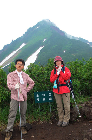 | なんとか非難小屋に着き、山頂へは持っていかなかった荷物などを整理し、下山します。 ちょうど、下の写真の右側に避難小屋が写っております。風雨や疲れのため、すっかり非難小屋の全容を撮らずに下りてきてしまいました…。長官山で記念撮影です。だいぶん晴れてきましたが、まだ、雲がかかっています。次回は、すっきり青空のもと登りたいものです。 |