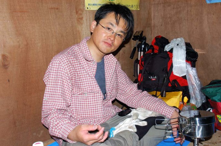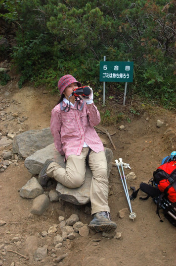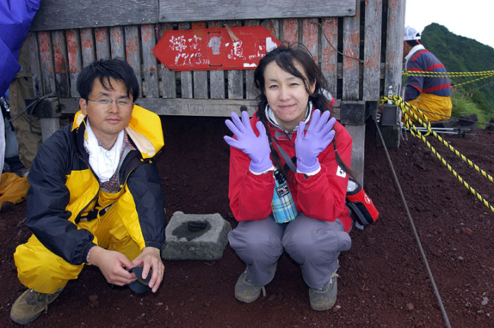 | 妻の体力もそろそろ尽きてきたようで、1合ずつ休憩です。 それもそのはず、この7合目付近で、既に出発から13時間経過しているのですから…。 |
