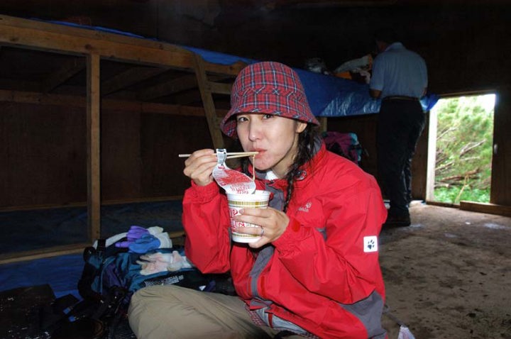 | 8合目を過ぎると、そのまま山頂へ向かうルートと、避難小屋へ向かうルートに分かれますが、私たちは、右手の避難小屋への緩い勾配の道を登ります。15分くらいで到着です。 ここで、しばし休憩し朝食です。お湯を沸かしまして、お馴染みの定番メニュー、カップラーメンです。 避難小屋での朝食時に、また、風雨の状態となりまして、これは、難しいかな〜と思っていたのですが、少し収まったようでしたので、いよいよ山頂を目指すことにしました! 妻は、完全に荷物無しの状態で登ります。私は、カメラ機材と防寒具などを入れたザックを背負います。ここから、まだまだ先は長いのです…。8合目で標高1,200mなんです。ということは、まだ500mの標高差があることになります。 |