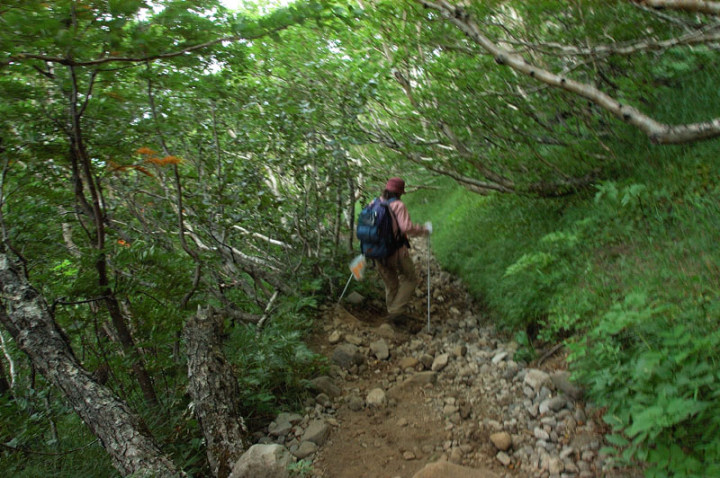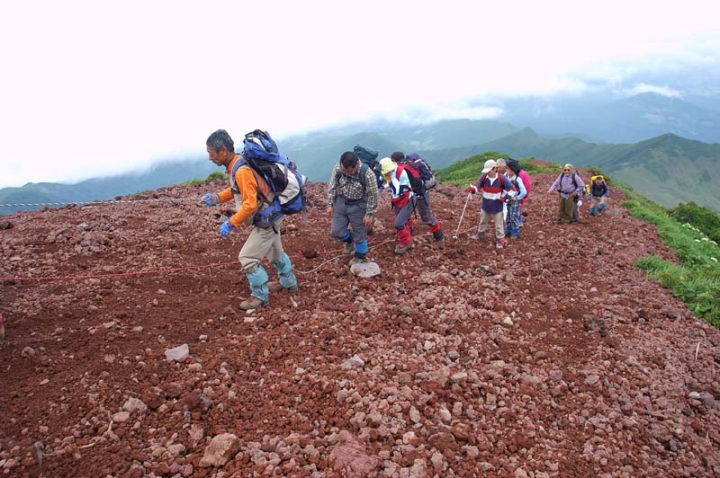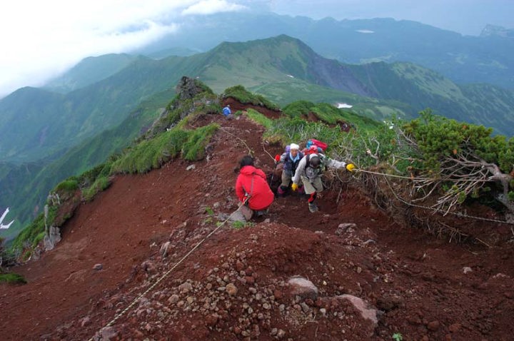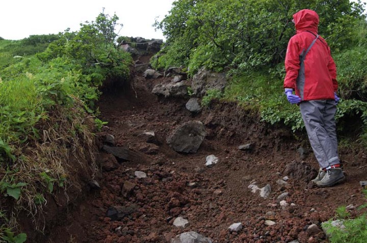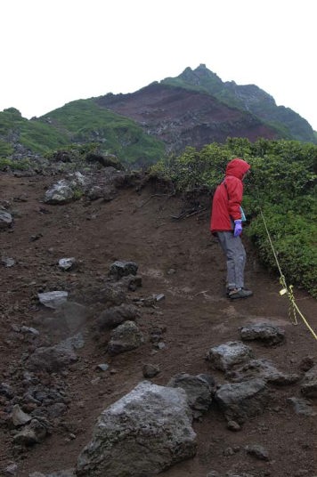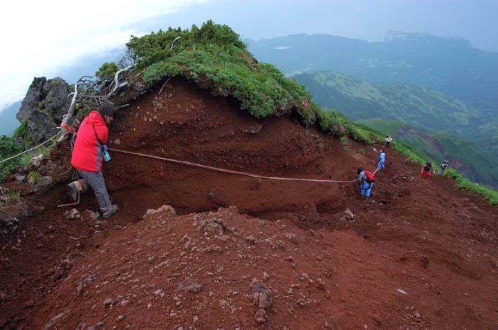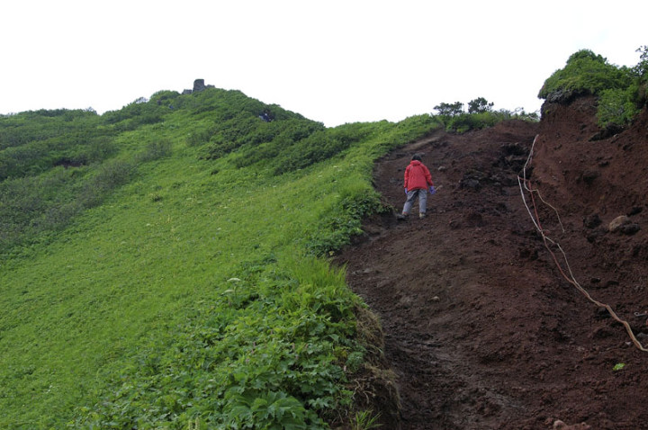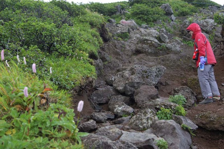 | こんな、稜線の風雨厳しい環境の中で、短い夏の間に精一杯花を咲かせるんですね…。 かなり登山道は崩壊しているのですが、このような急な登りを一歩ずつ踏みしめてゆきます。 |