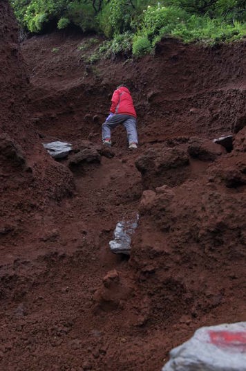 | 登山道はこんなにも侵食されて、えぐれております。 ちょうど、この辺りで、妻の目がすれ違う登山者のうちの一人をしばらく凝視して、「○○(いとこ)ちゃんじゃない??」と言ってきます。確かに、似ていますが…、まさかね〜、と言っているうちに、その方も見えなくなり、こちらも確かめる余裕もなく、そのままになってしまいました。 |