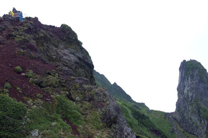 | 先ほどの岩は、頂上では無かったようですが、どんどんと近づいてきまして、いよいよ山頂が見えてきました! 右手に見えるのがローソク岩です。 左上の頂上で、休憩している登山者が見えます。 |