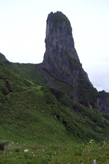 | 山頂付近では、雨は止んでいましたので、もう少し、天候が良ければ…、という感じでした。 それでも、切り立った山の姿は、まさに山岳と言えるような光景でした。 普段は、大雪山などの、比較的なだらかな山を見ているので、利尻山の荒々しさは新鮮に思えました。 |