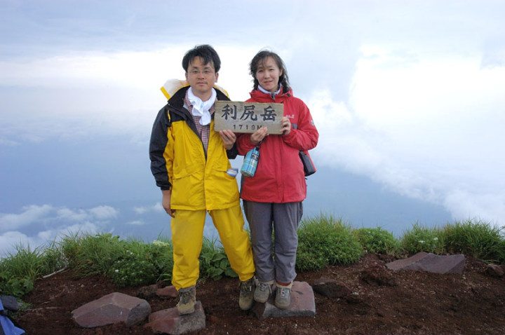 | そして、ようやく山頂に到着!!午前9時を少し過ぎたところでした〜。 それにしても、長かった…、厳しかった…。 山頂は、かなり狭いのですが、もう、登山者で溢れています。座るところもないくらいに混雑していました。百名山登頂を目指す本州などの方が多かったです。しかも、50代以降の熟年者が多かったです。すごいですね〜。 「利尻岳」のプレートを持った下の写真で少し分かるのですが、利尻山は切り立った山頂なので、大気の流れを変えるといいますか、変化をもたらせるように思います。ちょうど、山頂に着いたとき、雲が山頂にぶつかって左右に分かれていました。そして、山の向こうでまた雲が繋がるのです。モーセが紅海を分けたような、不思議な光景でした。 NHKのロケ班も来ておりまして、避難小屋に長期滞在して、いろいろ撮影しているとのことでした。来年に放送されると言っておりました。ザックの中に、厳重に包んだカメラや、三脚など超重量級の機材を入れ、背負っていました。女性の方も重たい荷物を背負ってヒョイヒョイ歩いていました。 |