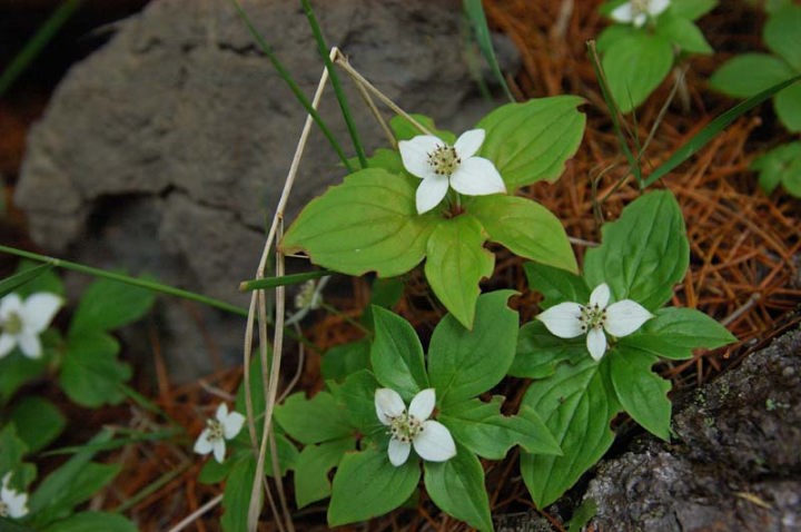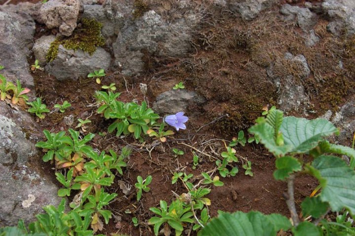 | まだまだ、山頂を目指す登山者に行き交います。 山頂を目指したときに比べると、風は強いですが雨が止みましたので、少し歩きやすいでしょうか…。イワギキョウ、ゴゼンタチバナなどが咲いています。ゴゼンタチバナはいろいろな高度で見かけました。 |