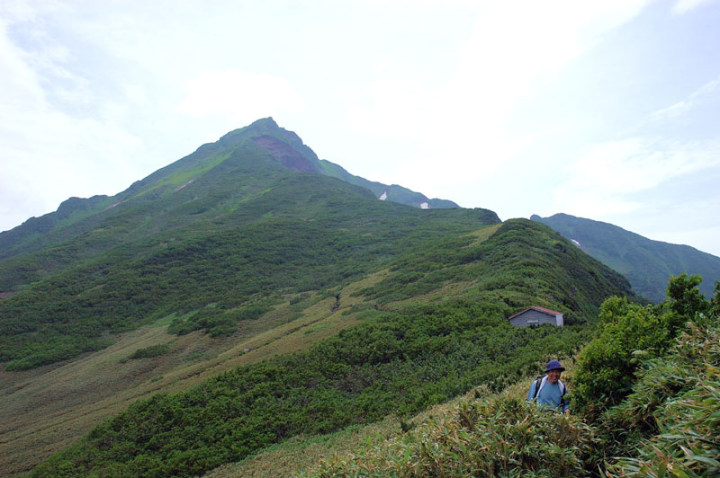 | 7合目の看板に「大曲」とありますように、ここからが、クネクネとした辛い登りとなりました。しかも、天候はどんどん悪くなり、風雨除けとなるような、岩や木々もあまりなく、稜線をものすごい速度で通過してゆく雲にさらされているような状態になりました。途中、大き目の岩がありましたので、そこで、しばし、風雨をしのぎましたが、これは、ちょっと登頂は無理かな〜、と思い出しました。妻も、かなりヘバリ気味です…。その頃、2人の若い男性が私たちを追い抜いて行きました。午前3時頃3合目を登り始めたようですが、我々、2時間のアドバンテージがありながら、早くも越されてしまった…。さすが、健脚家は違います…。 でも、8合目先にある避難小屋まではなんとか行って、温かいご飯にあずかりたい!という思いをバネに、なんとか先へ進みます。 しかも、7合目までは比較的、急な勾配も無く、1合ずつの間隔も短く、あれ!?もう7合目!?と早く感じられたのですが、ここからが、長く急な登坂となり、荒天も相まって、妻も脱落寸前!? 当然、カメラなど出すこともできず、ひたすら我慢の登り…。 そして、7合目から登ること1時間40分、午前5時50分頃にようやく8合目へ到着! この7合目から8合目までの間で、利尻山の厳しさを味わいました。もう、なんて大変な登山なんだ〜と思わされました…。 しかし、8合目の長官山というところから見る利尻山頂の美しいことと言ったら…。なんだか、この勇壮な眺めを目にすると、今までの疲れがフッとなくなるかのような感覚でした。 幸い雨は上がったものの、好天とは言えない状況ではありましたが、本当に素晴らしい景色でした。山の厳しさと素晴らしさを短時間で味わった印象です。 この眺めが青空だったら、どんなに素晴らしいのだろう…、と想像してしまいます。 |
