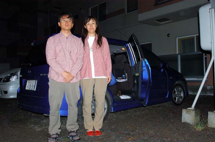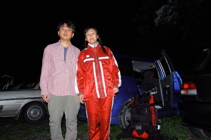 | あちこちで、食糧などを調達し、午前3時頃到着です! 登山口のクチャンベツですが、層雲峡温泉街から国道39号線を北見方面へ行き、少し行きますと、国道273号線に分かれます。層雲峡温泉街から約15kmの地点に大雪高原温泉への右折路があり、そこから5qほど砂利道を上がりますと、高原温泉(右に大きく曲がる)とクチャンベツ(ほぼ直線)のヤンベ分岐というところがあり、そこを直進しますが、直ぐに施錠されたゲートがあります。この鍵のナンバーは事前に層雲峡のビジターセンターなどで確認しておく必要があります。さらにそこから8qほど進みますと、クチャンベツ登山口が見えてきます。 まだ、午前3時というのに、登山口には既にかなりの台数の車が止まっています。山で泊まっている方々の車もありますが、これから出発というグループの方々が車で仮眠をしております。十数台は車がありました。 私たちも、準備をして、体操をして、トイレに行き、いざ出発!! なんか、ふたりとも興奮しているからか、それとも、眠いのか、不思議な顔をしていますね…。 登山口には、トイレと休憩所のような建物があります。午前3時15分、まだ外は真っ暗ですが、ヘッドライトを灯して出発です。 |