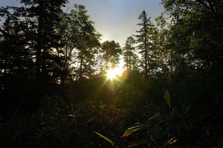 | 木々の切れ目からようやく太陽が見えました。午前5時です。 |
