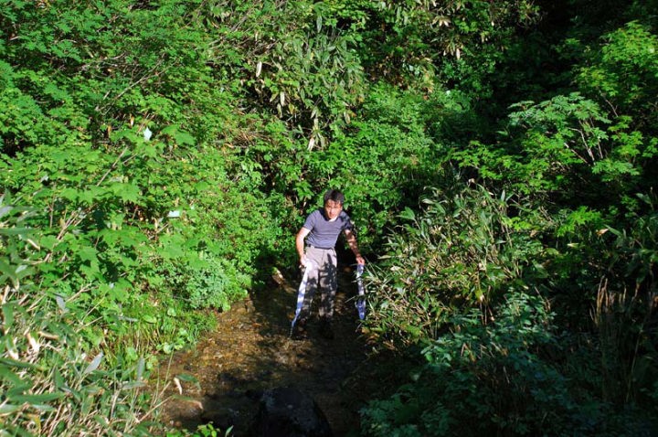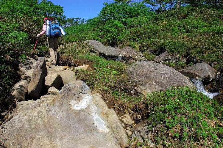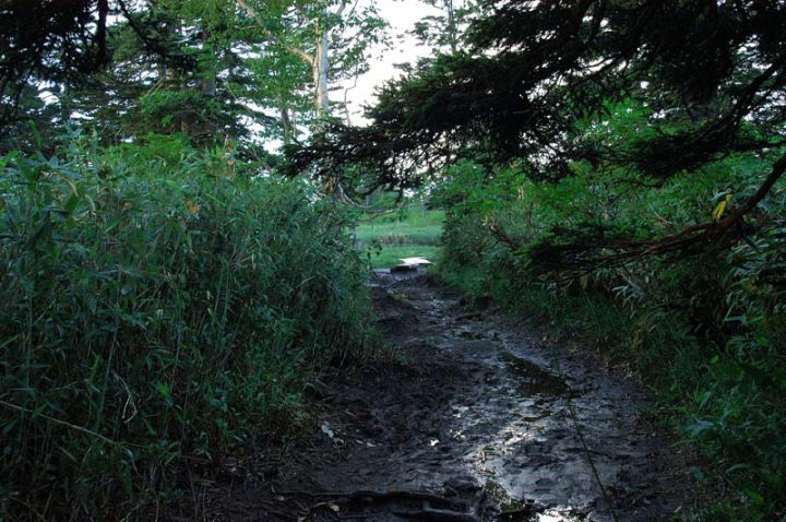 | しかし、ここからが一番の難所となるとは…。 この沼ノ原から30分ほどの五色の水場で、しっかりとした朝食にしようかと思っていたのですが、沼ノ原を過ぎたあたりから、私の人生でこれほどまでの蚊に取り囲まれたことは無い、と言えるほどの、蚊の襲来を受けまして、もう、閉口です…。そうですね、常時、30〜40匹に取り囲まれながらの歩行です…。かなり、凹みました…。 そうこうしているうちに、五色の水場に着きました。水場では蚊も少なくなるかな〜と思ったのですが、一向にその気配はなく、もう散々…。冷たい水(これはかなり気持ちよかった…)で顔を洗い、おにぎり一つくらい食べて、さっさと退散です。その後も、40,50分は取り巻きの蚊とぬかるみの道に難渋し、もう、帰りたい!とか思いながら早足で駆け抜けました…。 そして、ようやく、蚊の居ない、歩きやすい場所へ出ることができました!!良かった〜。 ちなみに、服の上から20箇所くらい蚊に刺された跡がありました…。なぜか背中まで…。顔も10箇所以上…。薬を塗りながらの登山です…。 |