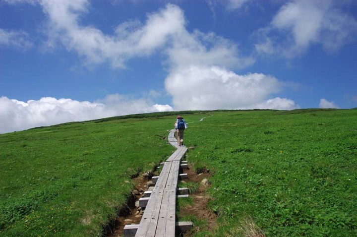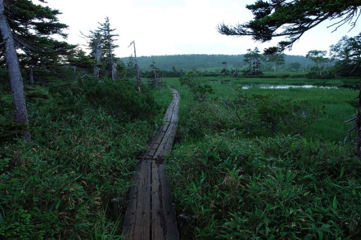 | ここまでの行程の多くが急坂だったのですが、途中、何度か緩やかな、平坦に思えると程の場所もありまして、そろそろ沼ノ原の入り口か!?と惑わされるのですが、まだまだ…。ようやく、1,320mの台地で「沼ノ原二・八`」の標識があり、そこから、緩やかな道を少しずつ高度を上げながら進みます。 そして、やっと、沼ノ原の入り口に辿り着きます。ここから数km木道が続きます。この時点で午前5時25分です。もう2時間以上経過しております。 |
