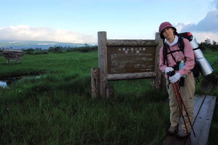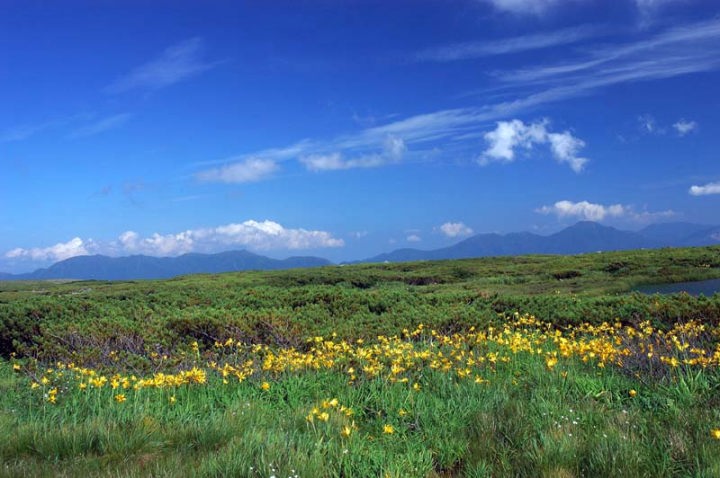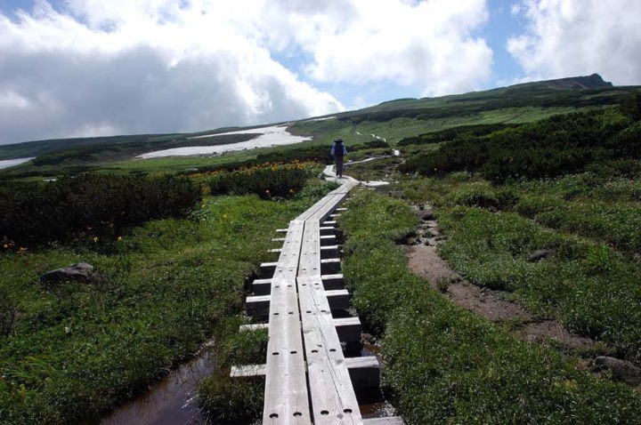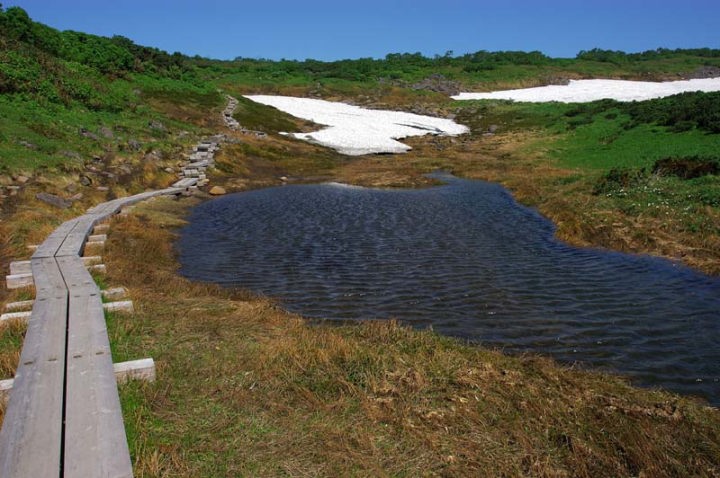 | 大小の池塘(ちとう)群を見ながらの歩行は今までの疲れ(もう疲れてる…)を癒してくれます。いよいよ沼ノ原分岐が迫ってきます!そして、到着!!遠くトムラウシ山方面はこのような感じでした。湿原の入り口には、シラネニンジン、ホソバノキソチドリなどが咲いていました。 |