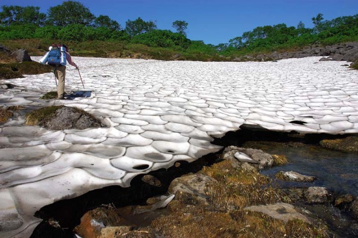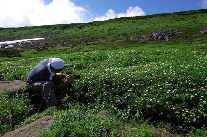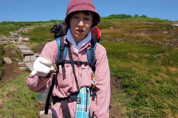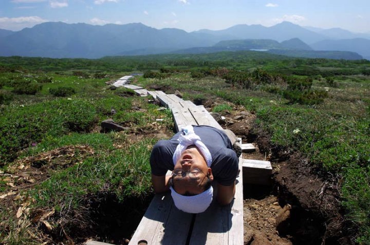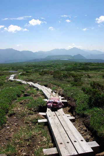 | 小休止し、さらに歩みを進めてゆきます。このような木道が各所に設置されておりまして、山深い場所にご苦労だな〜と感心です。登山道脇にはいろいろな花が見られるようになりました。ミヤマキンバイ、キバナシャクナゲとエゾコザクラなどなど。 そして、雪渓の上には、結構な数のトンボが動けなくなっています。 雪の上に止まったはいいけど、寒くて弱ってしまうのでしょうか…。 そして、五色ヶ原と呼ばれる花の名所の手前で、きれいな撮影ポイントを見つけましたので、小1時間撮影に没頭しました。その間、妻は、あまりの気持ちの良さに、登山道の真ん中で寝てしまいました…。と言っても、私が近辺に居ましたので、他の登山者が来られたら直ぐに起きられるようにはしておきました。でも結局小1時間誰も来ませんでした…。 それにしても気持ちのよい登山日和です。 私も、一撮影終えてから、次なる高みを目指し、足運動をしましてほぐします。 |