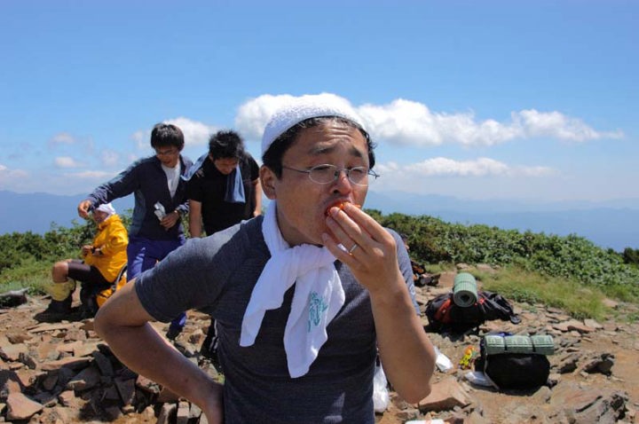 | そして、ようやく五色岳へ到着!!既に正午近くになっておりました…。 あまり山頂という感じのしない山ですが、忠別岳方面、沼ノ原方面、化雲岳方面への分岐点となりまして、あちこちから来た登山者が情報交換をしております。 ここで、軽く昼食をとります。 |