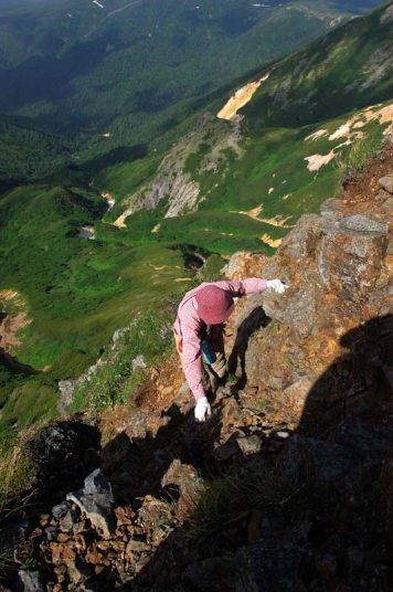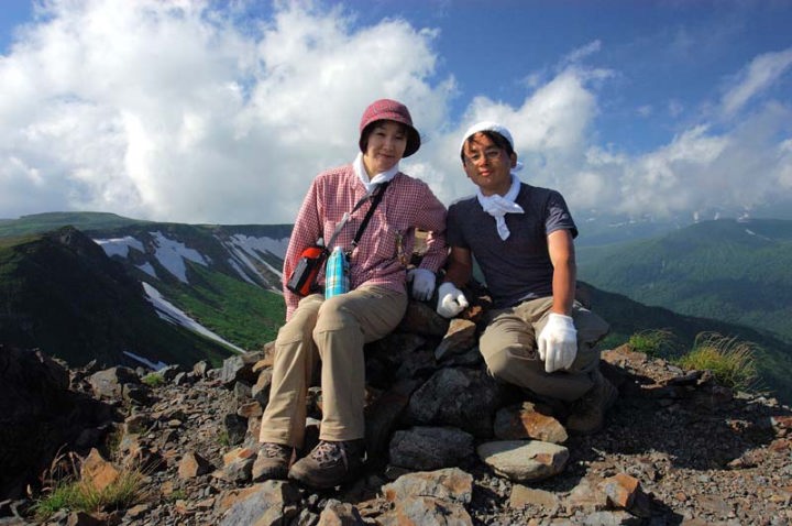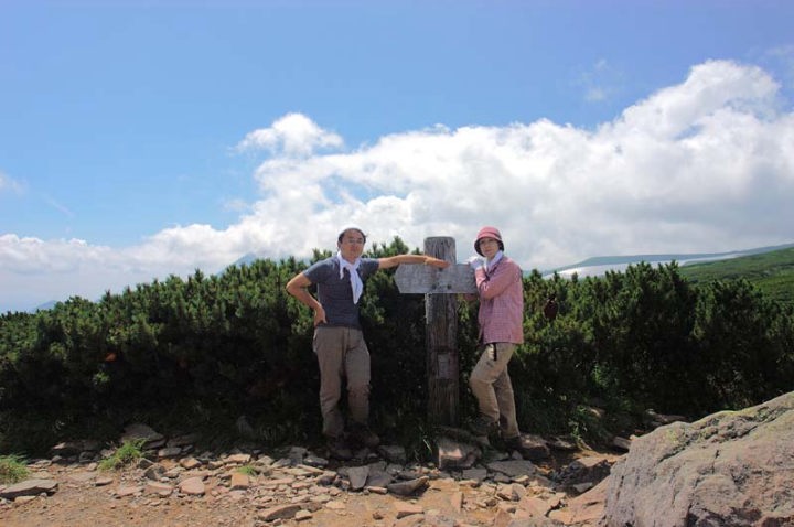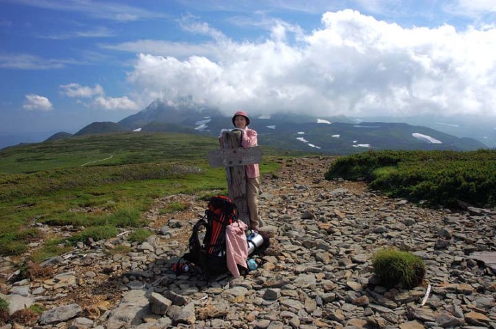 | そして、ようやく化雲岳に到着!! おへその逆側がトムラウシです。雲に隠れていますが…。 早速記念撮影です!! こうなりますと、へそにも登ってみたい!!へその向こう側から登るのですが、もう崖です!すごい急です!落ちたら…、です…。でも、登ると見晴らし最高です!!おへその上でも記念撮影! |