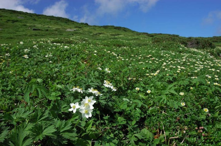 | 1時間ほど休憩をし、その後、大雪のへそのような化雲岳を目指します!! そして、この道中も花々が素晴らしく、標準時間を大幅に超えるほど写真撮影に没頭です…。 エゾノハクサンイチゲ、エゾノツガザクラ、アオノツガザクラ、エゾカンゾウなども満開!! さらに目指します!右端に見える切り立った部分が化雲岳です!!あと一息!! |