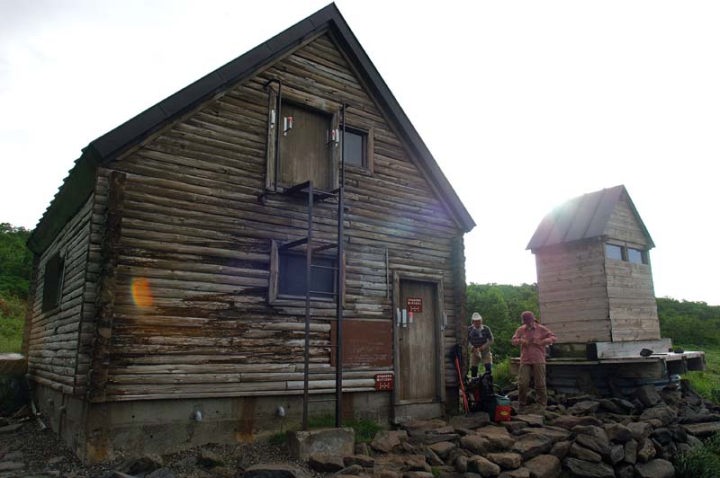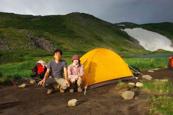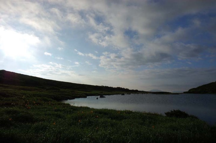 | 前日、25sほどのザックを背負い、15km以上の山行をしたためか、ぐっすりと休むことができました。 そして、午前4時頃東の空が白やみ始めましたので、テントから身を乗り出し、空を見てみると、まずまずの天候。天気予報はあまり良くないとのことだったのですが、これは期待できそうです!それにしても、テントの外は夏にも関わらずかなり冷え込んでおります。やはり、北海道の1800mほどの高地に来ますと、夏でも寒いものですよね。 |