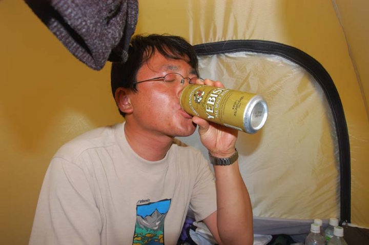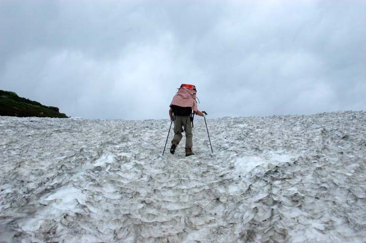 | 朝食を済ませ、出発前に記念撮影です。 その後、準備をし、トイレに行き、出発です。 途中、沢で顔を洗いまして、これがまた冷たくて、気合が入ります! まず雪渓があるのですが、昨日の下りも滑って大変でしたが、登りもかなりキツイです…。ちなみに、この日は、私だけ荷物を背負って、妻は荷物も無く軽々とした状態で山頂を目指します。 |