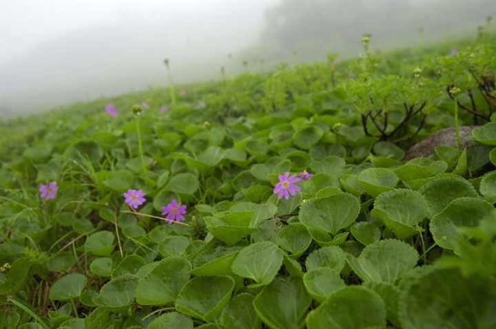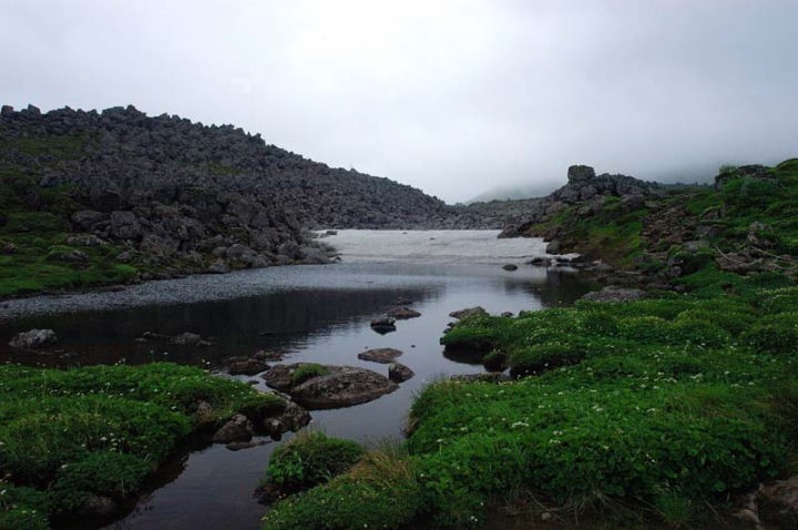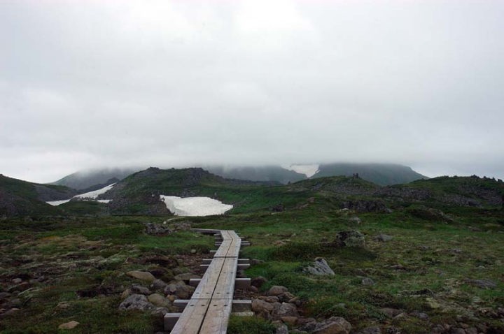 | 日本庭園に差し掛かりますと、ぼちぼち花を見ることができます。イワブクロが咲いています。 ただ、トムラウシ山頂は嫌な感じの雲で覆われていて、全くその姿を見せてくれません…。大丈夫でしょうか!? 日本庭園と言うだけありまして、本当に天然の庭園かのような光景です。だれかが配置したわけでもないのに、自然の力とは素晴らしいものです。本当に庭園のようで、美しかった…。このような渋い天候でも庭園の雰囲気が幻想的に感じられますが、まぶしいばかりの太陽が差し込む早朝などもきっと美しいのだろう、と思いを馳せながら進みます。 沼の辺には、イワイチョウが咲いておりました。本当にたくさんのイワイチョウです。 |