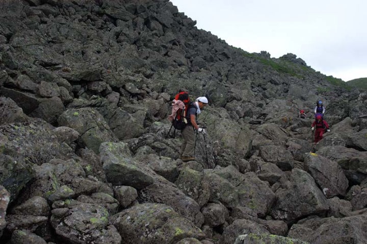 | ロックガーデンを抜けた頃、登山を楽しむ家族連れとすれ違いました。で、ビックリ!!両親に子ども3人ですが、一番小さな子は、まだ小学校前という感じです。よく、トムラウシから来たな〜と関心。お父さんお母さんは重たいザックを背負い、子どもたちも彼らにとって相応の重たいザック背負い、夏休みを楽しんでいるのでしょう。とても微笑ましい光景に思わずカメラを向けてしまいました。下の子はかなり辛そうでしたが、これが、山頂に立ったときや美味しい食事を食べたときに、山の素晴らしさを子どもながらに感じることでしょう。こんなにも早い時期に山に出会えることは、人それぞれですが、とても貴重な経験だと思います。この経験をどのように人生に生かしていくのでしょうか…。 |