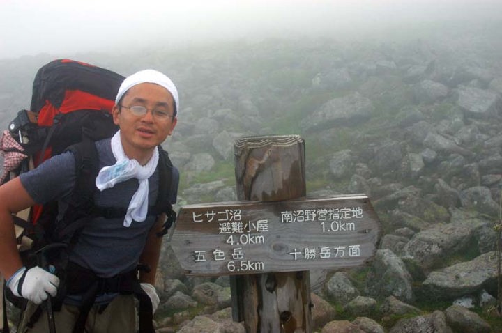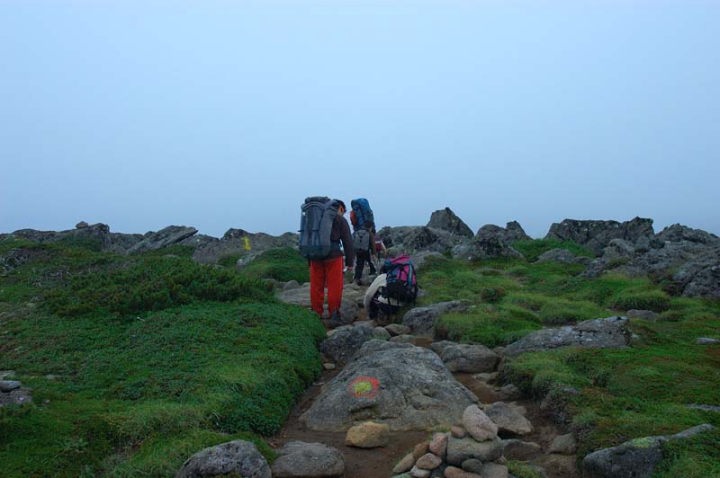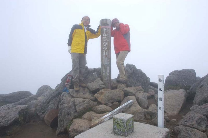 なんとか、雨には当たらずに山頂に到着することができました。山頂付近はかなり大きな岩が行く手を阻む感じで、体を捻りながら慎重に歩みを進めました。 が、しかし…。雲に覆われ展望は全く無し。本当に、標識を見てただトムラウシ山に登ったんだ!という印象。しばらく待ってはみたものの、一向に雲が晴れる気配無く、逆に雲は厚くなるばかり…。 |