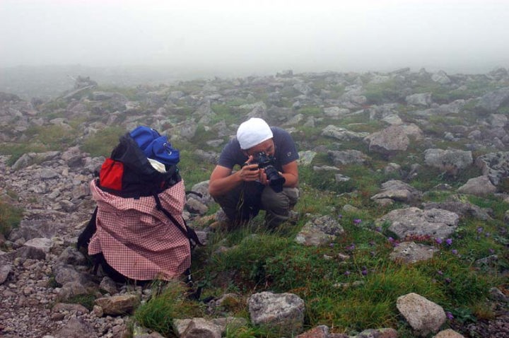 | この後、かなりの花を楽しむことができました。ダイセツオリカブト、エゾノマルバシモツケ、イワギキョウ、エゾウメバチソウ、ウスユキトウヒレン、エゾイワツメクサなどを撮影できました。でも、天候がどんどん悪くなってきまして、これは写真撮影どころじゃないかな〜という感じです。 |