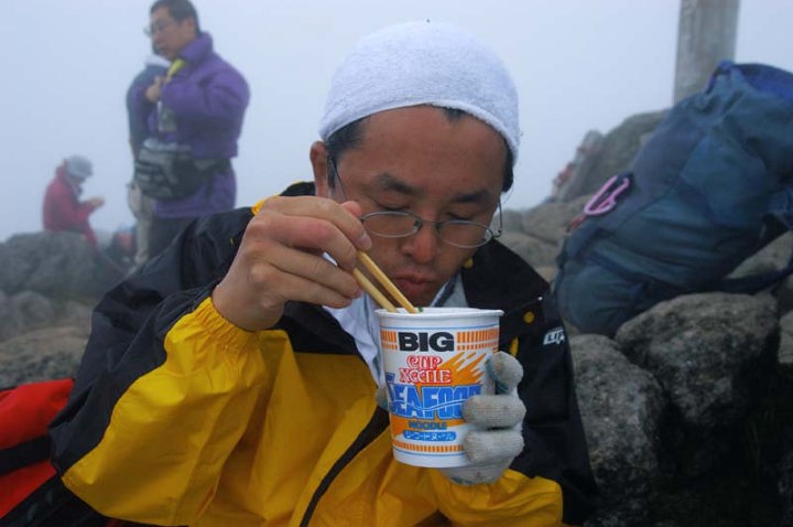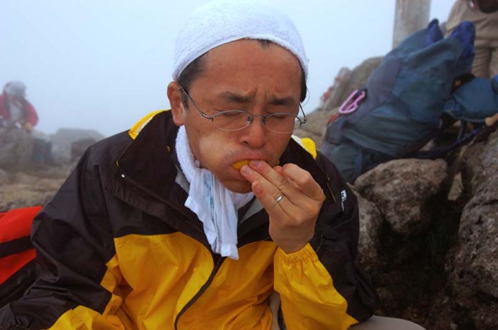 | とりあえず、昼食にします。まず、レモンをかじります。これは、美味い!!体にエネルギーが行き渡るような感じを受けます。そして、使い古しのカップラーメンの容器でお味噌汁を作り、飲みました。これまた、汁物は美味い!!あと、ご飯。これまた美味い!!もう、山の上で食べるものはどんなものでも美味しいですね!! 昼食中、私たちとは別方向の新得町トムラウシ温泉から登ってきた2つの団体さんが登頂されまして、山頂はかなりの賑わいに…。トムラウシ温泉から登るコースは日帰りが可能なコースですので、ツアーの方はこちらから登ることが多いのでしょうね…。参加者はやはり50代、60代の方々が多かったかな…。 それにしても、登頂しておにぎりなどを10分程度で食べて、直ぐに下山。もうちょっと登頂の余韻に浸りたいな〜と思う方々もいるのではないでしょうか…。でも、まぁ、日帰りでトムラウシですから、しょうがいないのでしょう。 |